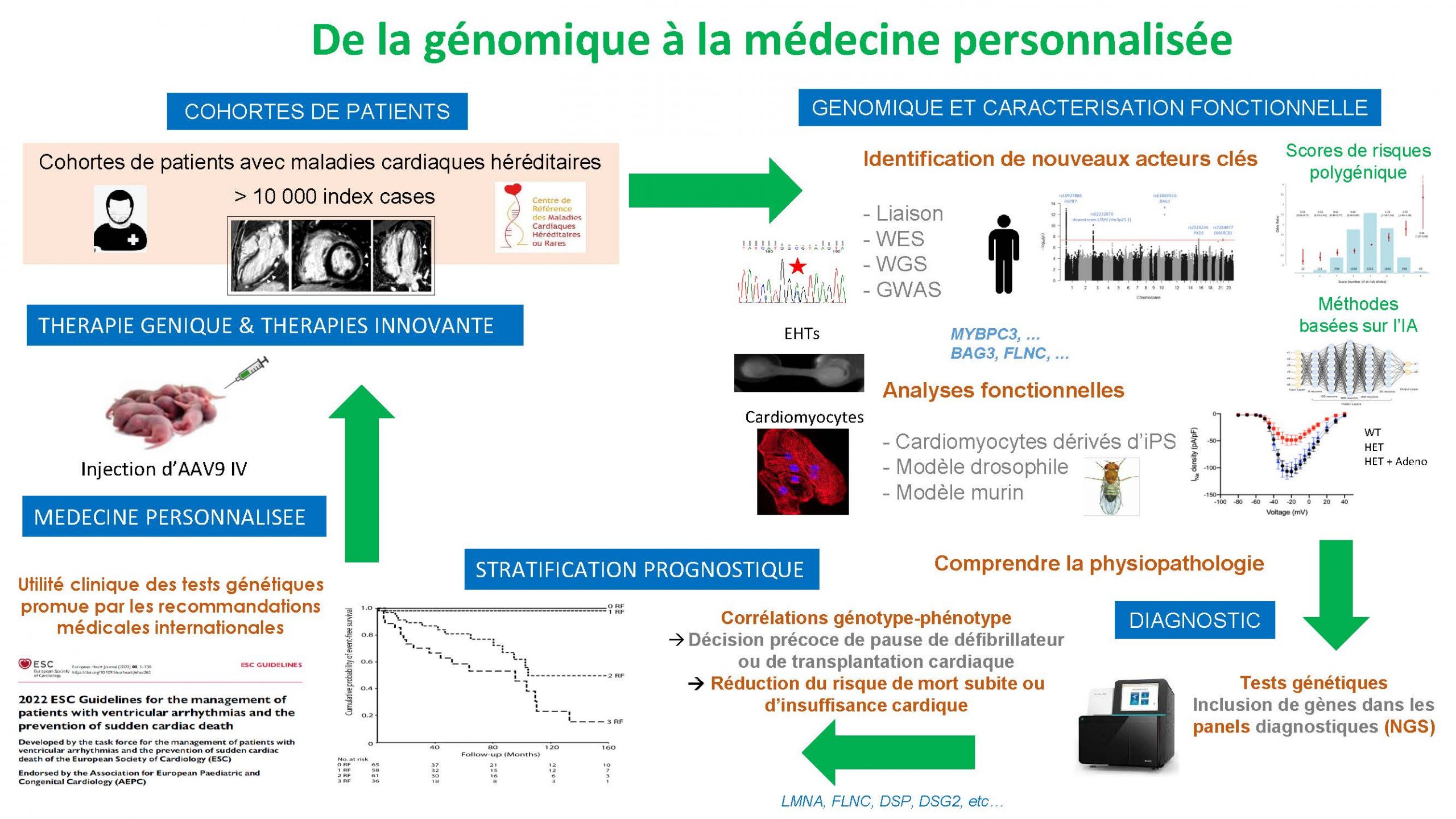 Depuis plus de 20 ans, notre groupe s’intéresse au décryptage des mécanismes génétiques et cellulaires sous-jacents au développement des cardiomyopathies et des canalopathies. Nous avons récemment identifié de nouveaux variants génétiques, rares ou fréquents, impliquées dans ces maladies grâce à des stratégies génomiques d’analyse d’association (GWAS) ou de séquençage. Nous étudions des voies de signalisation sous-jacentes et initions de nouvelles approches thérapeutiques à partir de ces avancées scientifiques. Simultanément, nous développons, dans la pratique clinique, des approches translationnelles comprenant des tests génétiques et un reséquençage à haut débit, afin d’améliorer la prise en charge médicale des patients et de leurs familles grâce à une médecine personnalisée.